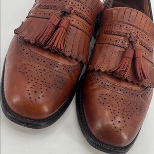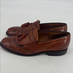 These brown genuine leather loafers by Allen Edmonds feature elegant tassels and traditional broguing, offering a sophisticated look. Style is Bradenton. The slip-on design ensures ease of wear, while the burnished finish adds a touch of vintage charm. Ideal for both business and casual settings, these shoes combine style and comfort effortlessly. Size 9.5. Great condition, however, the left toe area has a scuff. See photo # 7. Not noticeable at all. Please see photos for measurements.
