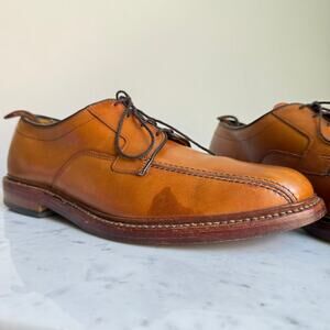Classic Allen Edmonds Hillcrest men’s derby shoes in rich tan leather. Handcrafted in the USA, featuring Goodyear welt construction, full leather uppers, and durable leather soles. Timeless split-toe design with waxed brown laces and clean, elegant lines. Comfortable fit and high-quality craftsmanship make these a wardrobe staple for both business and smart-casual wear.
