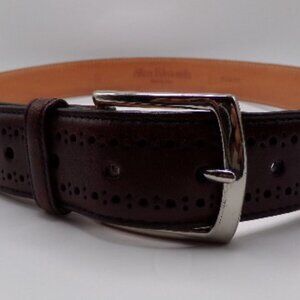 Gorgeous Allen Edmonds Manistee dress belt. Has the brogue styling from the classic shoe, goes perfect with chili color shoes. Handcrafted in America and has a silver tone buckle. Size states 32 but please go by these measurements to ensure that perfect AE look and feel. Top of leather buckle to bottom leather measures 38 1/2". AE tends to be true to size but please ask with any questions. has minor scuff mark by the buckle please view pics.
