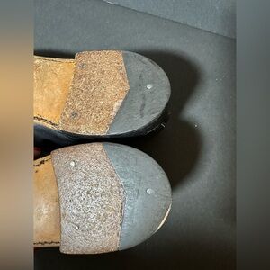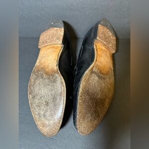 well-worn black leather tassel loafers with visible scratches and creasing, particularly on the toe and vamp areas. The soles also show signs of wear. The tassels are intact but slightly frayed. These details suggest the shoes have been used regularly.