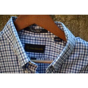 Classic Allen Edmonds men’s button-down shirt in a versatile blue and white check pattern. Made from 100% wrinkle-free cotton, this shirt is designed for easy wear and care while maintaining a crisp, polished look. Features a button-down collar, chest pocket, and button cuffs. Perfect for both business casual and everyday wear.
