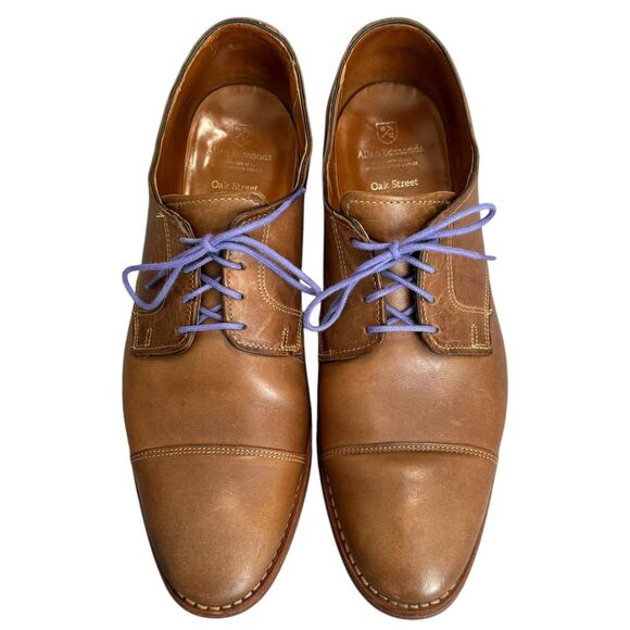 Elevate your style with these Allen Edmonds Oak Street brown cap toe Oxford dress shoes. Crafted with genuine leather upper, lining, insole, and outsole, these shoes are built to last. The classic solid brown color and cap toe design make them perfect for any formal occasion, whether it's a wedding, business meeting, or a day at the office.