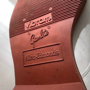 They are a men's size 10-1/2 and have a Vibram Gumlite sole. There are some faint stains on the front of both shoes (see close-up above) that are visually subdued.