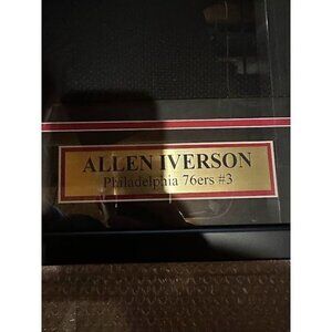 Allen Iverson signed autographed Philadelphia 76ers customer jersey framed black frame with black over red double v formatting with 2 Philadelphia 76ers pins, 2 2001 NBA Finals photos, and gold plaque reading: (1st line, Allen Iverson; 2nd line, Philadelphia 76ers #3) authenticated by PSA