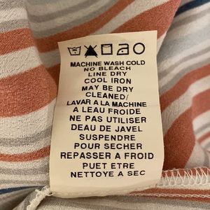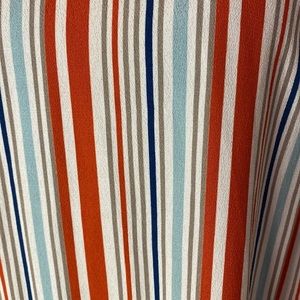 Dark orange, slate blue, olive green and white stripes. Silver exposed zipper. Recently dry cleaned.
