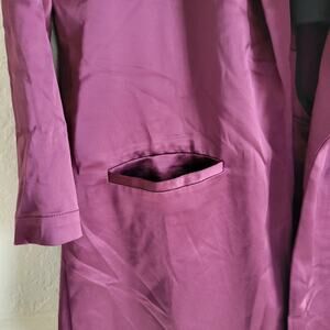 Burgundy satin (75% Triacetate, 25% Polyester). Jacket. Long sleeves. Partially lined. Front pockets. 41" from shoulder to hemline.