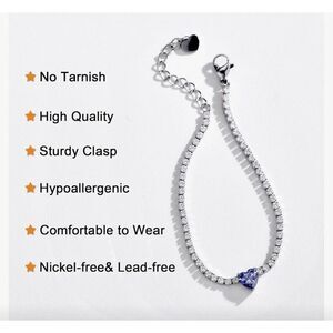 New in Gift Box AllenCOCO Heart Birthstone Sterling Silver Bracelet Hypoallergenic 14K White Gold, Stone Blue. September Birthstone