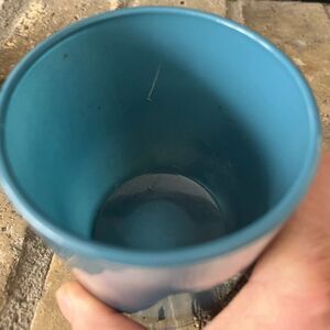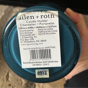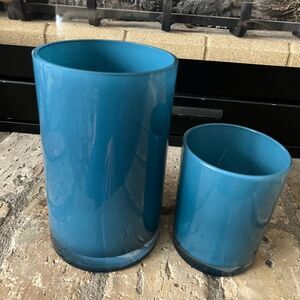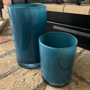 Allen+Roth blue 2 vase/candle holder set, clear vase, good preowned, condition, small vase has a couple thin scratches inside, size. 5x8 (big) and 4x5 (small) inches. Really pretty, can be used as a flower, vase or candleholder.
