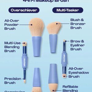 This Allure award-winning 4-in-1 makeup brush packs all your essential beauty applicators in one easy tool: Blush & Bronzer Brush, Blending Sponge (replaceable), Brow & Eyeliner Brush, and All-Over Eyeshadow Brush. Sweep, blend, blur, and line to your heart's content with this ultra-compact, travel-friendly MVP.