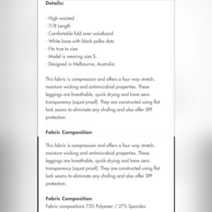 This fabric is compression and offers a four way stretch, moisture wicking and antimicrobial properties. These leggings are breathable, quick drying and have zero transparency (squat proof). They are constructed using flat lock seams to eliminate any chafing and also offer SPF protection.