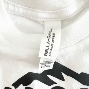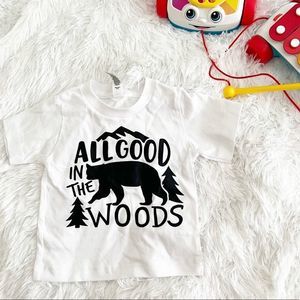 Adorable 6-12mo infant graphic tee with all good in the woods text and bear detail! Hand crafted by Raine & Company. This is a light weight, super soft tee. Perfect for rolling around the house or running errands out & about!