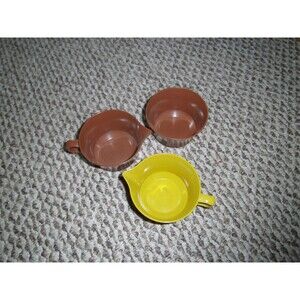 VINTAGE ALLIED CHEMICAL GOLD YELLOW MELAMINE Creamer & Brown Creamer & Sugar Bowl. 2 Brown pieces have no markings on bottom, but Creamer has same seam as the Yellow Allied Chemical Creamer on handle. Could be cleaned. I see no chips or cracks. Measures about 2.25 inches tall and mouth is about 3.5 inches across. Spout to handle is 5 inches across. NOTE: Only Yellow Creamer is marked ALLIED CHEMICAL. ? Airline or hospital like dishes. 3 pieces. Estate sale purchase.