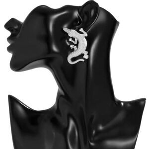 These earrings feature a pair of alligator or crocodile designs with a glossy, silver-tone finish. The textured pattern on the surface mimics the natural skin of a reptile, giving them a bold and striking appearance. The earrings have a three-dimensional form that adds depth and realism to the animal motif. They are designed to be statement pieces, perfect for adding a touch of edgy and exotic flair to an outfit.
