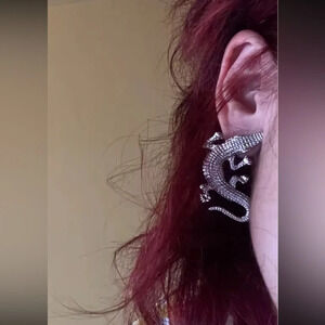 These earrings feature a pair of alligator or crocodile designs with a glossy, silver-tone finish. The textured pattern on the surface mimics the natural skin of a reptile, giving them a bold and striking appearance. The earrings have a three-dimensional form that adds depth and realism to the animal motif. They are designed to be statement pieces, perfect for adding a touch of edgy and exotic flair to an outfit.