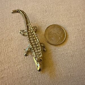 Alligator silver-tone brooch with clear rhinestone detail and pin back. Alligator’s eyes are green crystal.