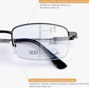 【Progressive Multifocal Glasses】Progressive multifocus glasses for all your need. Top part is zero magnification for walking, shopping. The middle part is slightly reduced power magnification for working on computer, watching TV, etc. The bottom part of the lens is full-power,used for nearly distance reading. It means that you can wear the glasses anytime and anywhere. If you are using progressive lens reading glasses for the first time, It takes a few days to get used to!