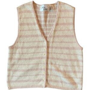 This Allison Brittney V-neck sweater vest in a soft peach hue offers a lightweight, airy knit perfect for layering. Its classic design and subtle texture make it a versatile addition to any wardrobe.