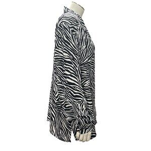 Unleash your bold side with this zebra-print oversized blouse by Allison Daley — a fierce artwear statement piece perfect for those who command attention. Crafted from 100% polyester with dramatic draping and a relaxed silhouette, this size 18 blouse invites self-expression with unapologetic flair. Whether worn open over a bralette or buttoned for drama, this piece is ready to elevate any day-to-night look. A true Classy City Chicks power move.