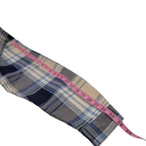 Style: Button down, roll up sleeve with button, plaid with metallic lines