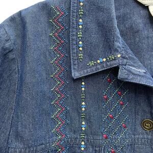 Allison Daley Denim 3/4 Sleeve Button-Front Shirt With Embroidered Detail. Size 16. 100% cotton. Colorful embroidered detail at front and on collar. 3/4 sleeves with button cuffs. Front pockets. Great for casual wear. Excellent preowned condition.