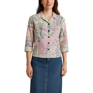 Keywords: Allison Daley petite blouse, floral patchwork shirt, cotton 3/4 sleeve button-up, spring summer casual top, size 14P women's shirt, cottagecore floral blouse