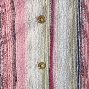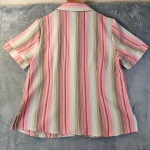 Allison Daley Petite button-up shirt in size 6P. Features a pink, cream, and taupe vertical stripe print with textured fabric, short sleeves, side slits, and button tab details. Lightweight and ideal for spring and summer casual or office wear.