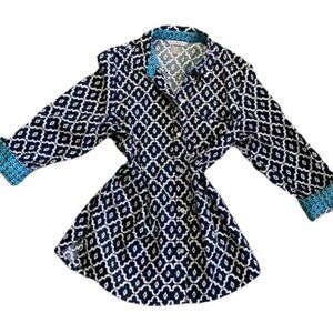 Add a splash of color to your wardrobe with this Allison Daley button-up shirt. The geometric pattern and contrasting trim accents make this top perfect for any occasion, whether it's a casual day out or a business meeting. The shirt features a collared neckline and 3/4 sleeves, with a regular fit and machine washable fabric for easy care. Made from a blend of cotton and spandex, this shirt is comfortable and versatile. Available in size 8, this shirt is a must-have for any stylish woman's collection.