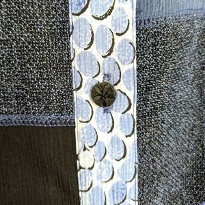 Allison Daley patchwork button down blouse with 3/4 sleeves.