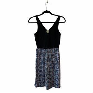 Allison Joy black & blue geometric fit & flare mini dress. In excellent condition! V neckline. Sleeveless. Fitted at the top & flares out below the waistline. V on the backside as well. Mini silhouette & lined. True black color on top half with blue & pink geometric print throughout the bottom half. Material is stretchy & lightweight. Size small.