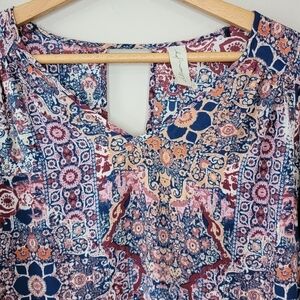 Mixed floral boho print blouse with keyhole back and high-low hem.
