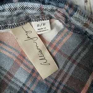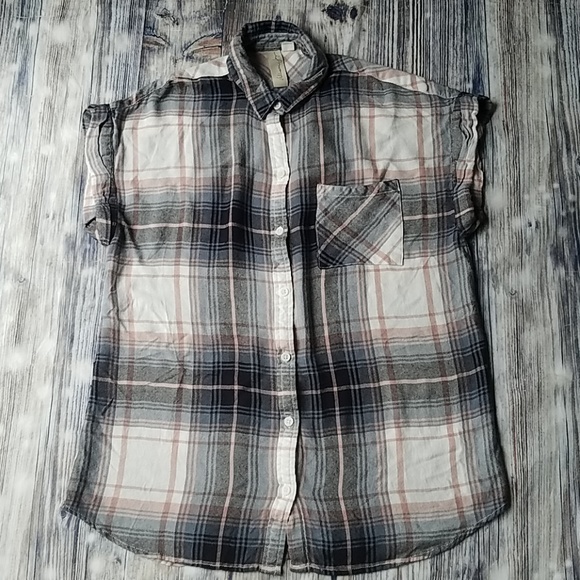 Allison Joy plaid short sleeve button up top size S. Super soft material in great used condition. Colors of blues, pink, black and cream. The rolled-up sleeves could use a little iron photo to show.