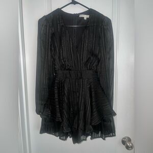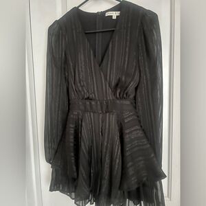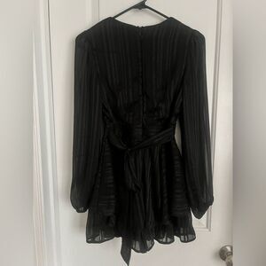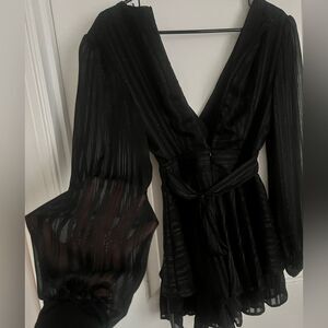 Features tie waist, sheer long sleeves, clinched wrists, and back zipper closure