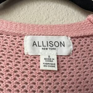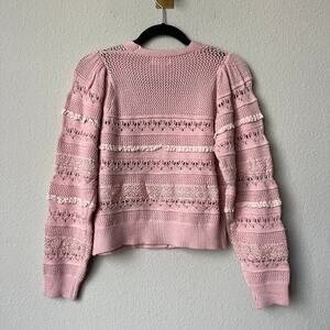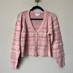 Allison New York 'Levy' crochet cardigan in soft blush pink. Features an intricate mix of knit and crochet patterns, subtle ruffle trim, a V-neckline, and button front closure. Feminine and lightweight — perfect layered over dresses or styled on its own. Size Small – 17" pit to pit; 20" total length.