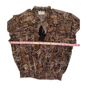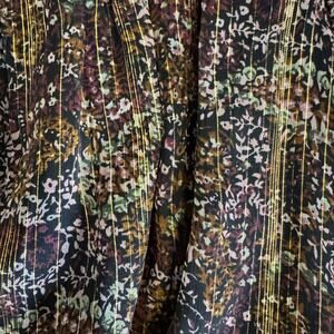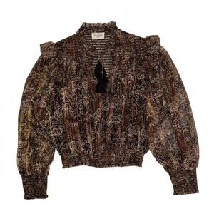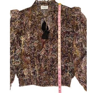 This gorgeous Allison New York two-piece set features a long-sleeve semi-sheer top with a flattering v-neckline and stylish puffed sleeves, paired with a matching ruffled mini skirt for a chic, feminine silhouette. The set showcases a black and gold multi-colored design that’s perfect for nights out, parties, or special events. The skirt is short and flirty with layered ruffle detailing, while the top adds an elegant, airy touch. Measurements shown in the photos are estimates only—please review them carefully for best fit.