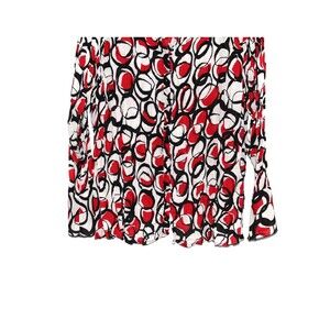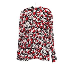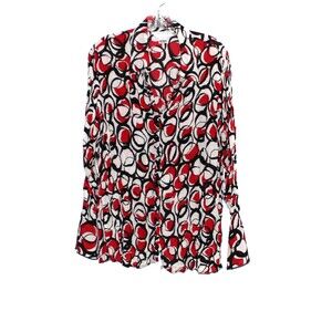 Allison Taylor blouse featuring pleated fabric, bell sleeves and a V-neckline with ruffle details. Button-down closure with hidden buttons. 100% polyester material with a geometric pattern in red, black, and white colors1 Size 1X. Machine washable. No rips, tears, holes or stains.