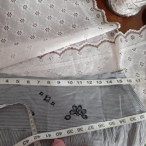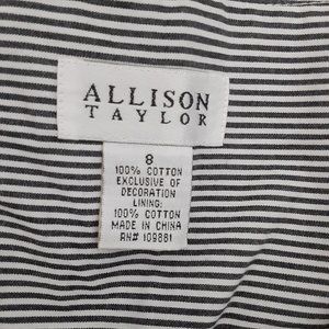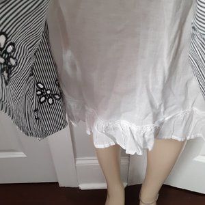 Allison Taylor Blue & White Pinstripe A Line Midi Skirt Applique Flowers size 8 measurements in photos excellent, pre owned as shown lined, light weight petticoat lining large drape ruffle hem zip closure waist fits high at waist, flat down to hip then flares out in a full A line style white petticoat underneath lightweight cottony fabric
