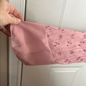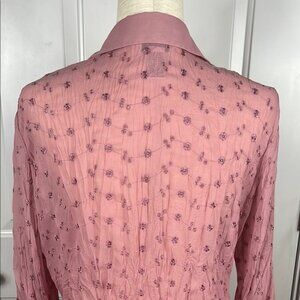 This elegant blouse by Allison Taylor features a romantic ruffled design cascading down the front, paired with long sleeves and a crinkle fabric. The sheer, soft pink/mauve hue and fabric with a subtle sheen make it a versatile choice for both professional and special occasions. Add a skirt or dress pants for wedding or other fancy occasion. Size Large.