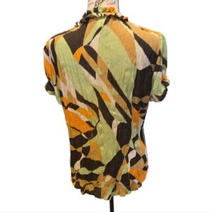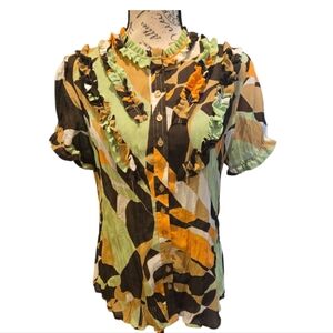 This elegant blouse by Allison Taylor features a vibrant orange hue with ruffled accents and crinkled texture. The short sleeves and lightweight fabric ensure a comfortable and stylish wear, ideal for both casual and dressy occasions.