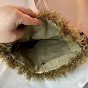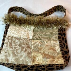 A very beautiful Purse handbag with Allison on the front embroidered label. ao inches by 8 inches by 3 inches. with carrying strap. tapestry material squares with bottom and sides are leopard print. heavy material. lined. with a pocket on the side. The top has fringe with threads and crystal drops beads all around the top.