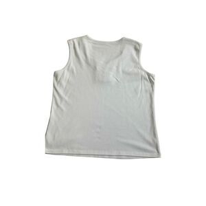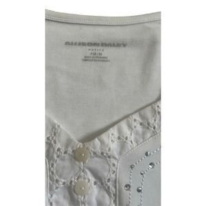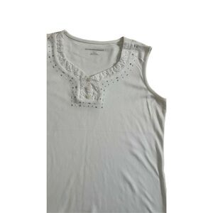 Sleeveless top size petite P/M. The top is made of a soft, stretchy fabric and features a decorative neckline with a button closure. The neckline is adorned with white eyelet lace and silver-toned embellishments. The top measures approximately 18 inches across the shoulders, 20 inches across the bust, 21 1/2 inches in length, and 8 inches across the armholes. The top is in good condition with no visible signs of wear or damage.