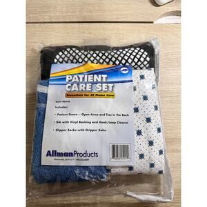 Ensure comfort and convenience with the Allman Patient Care Set, essential for at-home care. This brand new, sealed set includes a patient gown with open arms and ties in the back, a durable bib with vinyl backing and a secure hook/loop closure, and comfortable slipper socks with gripper soles for added safety. Perfect for individuals recovering at home or for daily patient care needs, this set provides practical solutions. Designed for easy use and care, it's a must-have for caregivers and anyone needing reliable home care essentials