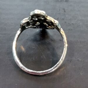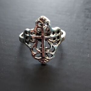 Handcrafted alloy silver cross ring size 7. Handcrafted so it will show some marks on the peice. I tried to capture in the photos. Smooth finish.