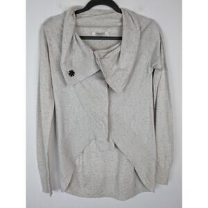 Features and description: cardigan sweater; speckled knit; large snap buttons; hi low hem; slouchy cowl neck; cream