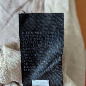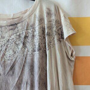Soft and flowy All Saints 'Lace Imprint' top. Cream or tan with pretty distressed looking lace design graphic. Roomy raw edge handkerchief hem. Oversized neckline can be worn off shoulder. Great with leggings, jeans or even on it's own as a super mini dress. Size 4 but very very roomy! A bit wrinkled from being put away but will wash out.