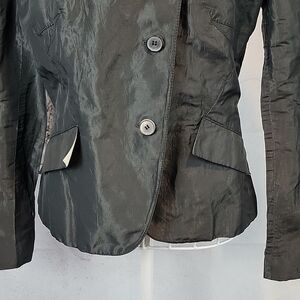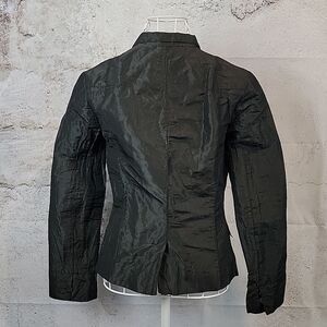 Manufacturers of quality garments Allsaints contemporary style jacket made of fine Italian cloth of an unusual combination of metal and polyester. This great jacket features a small notched collar, 3 button assymetrical front closure, and tailored at the waist in a short silhouette with a back vent. A rare find and in great pre-owned condition.