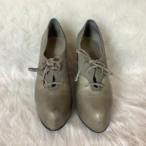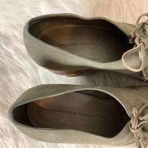 This is a pair of grey suede & leather, lace up, structural wood wedge heel Oxford shoes from Allsaints. Some wear on foot beds and soles. Scuffs on heels. Avant garde. Allsaints size 38 = US 7.