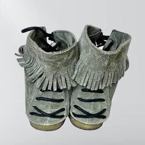 Fringe along the top edges, criss cross lacing on the back. Black laces.