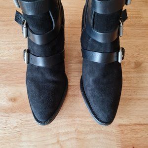 tags suede leather pointed toe boots heels strappy buckles moto grunge goth western boho bohemian minimalist black