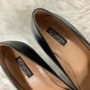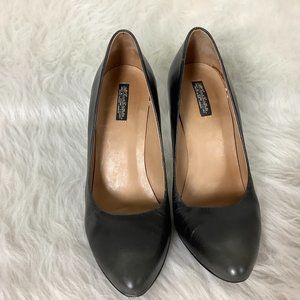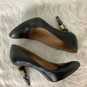 This is a pair of black leather, gold and silver metallic tone bead heel pumps from All Saints Spitafields. Jacks Place. Light creasing. A few faint scuffs. Some wear on foot beds and soles. The beads on one heel spin. Party, avant garde, evening, boho, bohemian, glam, jeweled. EU 38 = US 7.