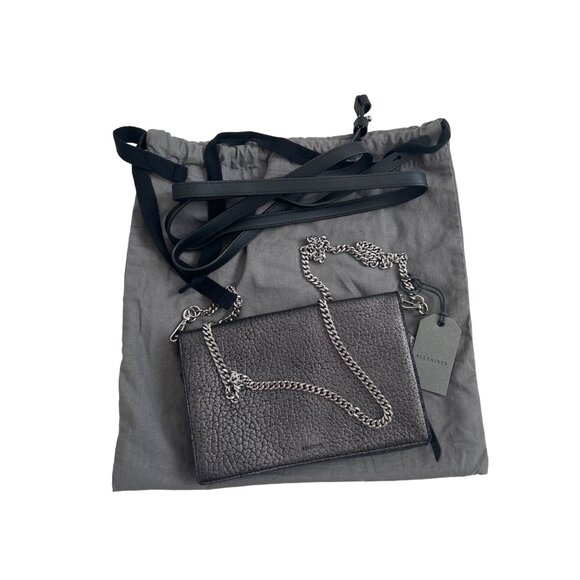 Elevate your style with this Allsaints crossbody bag, crafted from pebbled leather in a striking charcoal grey metallic finish. Featuring two removable straps and multiple compartments, it combines elegance and functionality. Ideal for both casual outings and formal events, this bag offers versatility and timeless appeal.
